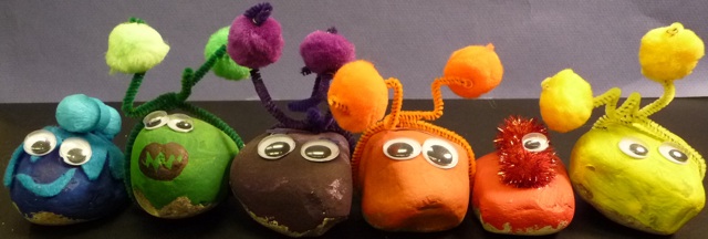 2. Once paint has dried, lay out an assortment of decorations (see material list) and have them choose matching colours to decorate each stone eg. blue pipe cleaners and pompoms for blue stone.