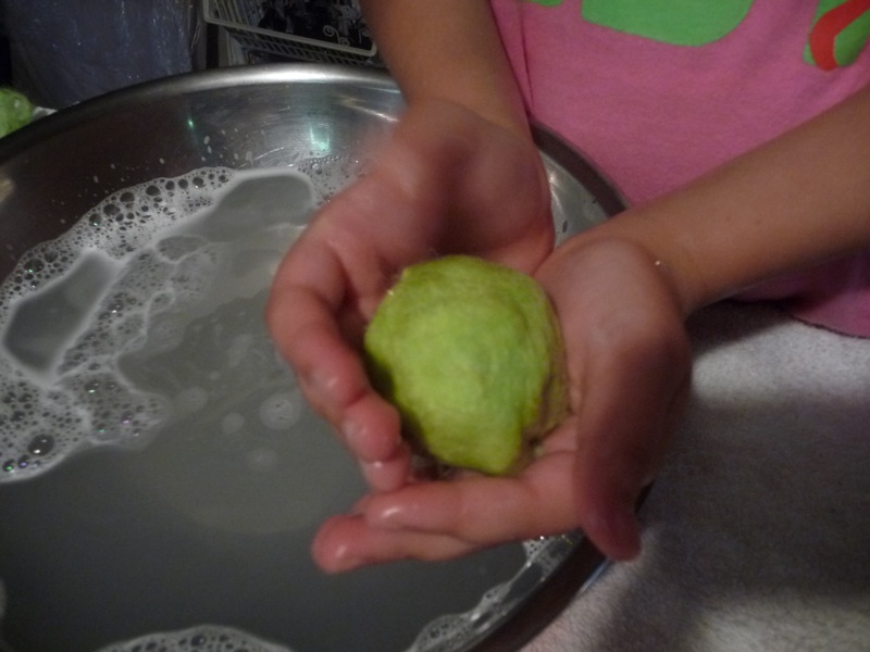 3. Once the yarn ball is made, take a thin section of white wool roving, separate the layers, lay it out flat, and begin rolling it tightly around one of your yarn balls. Make sure to turn it while rolling, so you maintain a ball-like shape. Continue to add sections of roving until the ball is about twice as big as you would like it, since the water will shrink the fibers. Make sure to add coloured roving for the outer layers if you don’t want the base colour of the ball to be white. You can use one colour or several, creating a number of different effects like marbling. I would recommend adding colour in this manner for younger children, to avoid poking themselves with felting needles. It does happen, and it hurts. Finally, hold the ball in your hands and very gently rotate it so the fibers hold well together in a ball-like shape.