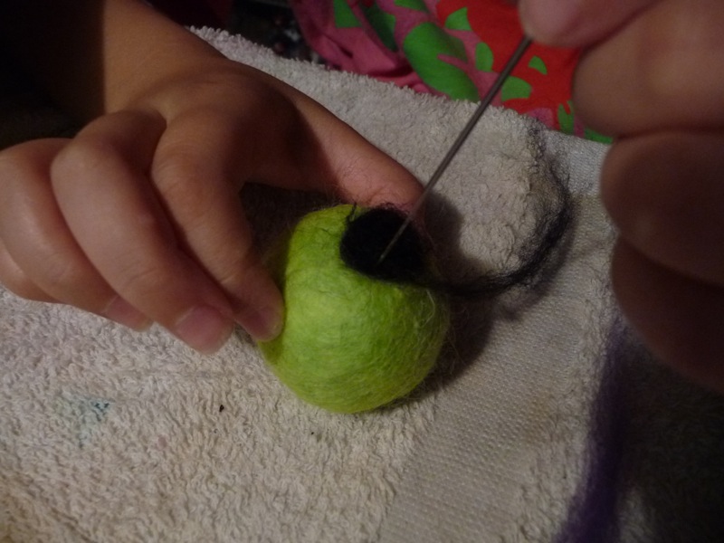 5. As you can see from the first photo, an endless number of patterns and colour combinations can be created. When applying smaller sections of colour to your ball, you will need a coarse felting needle. These are  available at knitting stores. Once you decide on a colour and pattern/shape, hold a small section of wool onto the ball and begin repeatedly poking the wool with a felting needle, until all the yarn is attached. Continue working your wool in this manner until your pattern has been created. With some practice, you will get the hang of it. I found that felting needles break easily, or maybe I lack finesse, so it’s best to have a couple on hand. They’re only $1 each.