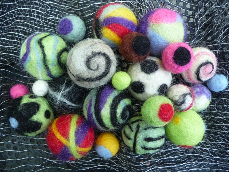 These felt balls were a lot of fun to make and became somewhat addictive. Colour combinations and pattern ideas are endless, so you can imagine how difficult it is to stop yourself unless you finally run out of wool, or simply can’t stand having prune fingers a minute longer.
