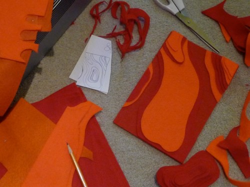 3. Select a piece of stiff felt to use as the base. Use regular (soft) felt for the rest. Both are available at art supply stores, and some fabric stores. Areas built up like mountains require cutting out similar shapes which become slightly smaller with each layer. It’s helpful to trace the shape out on the felt using a pencil, then cutting inside the pencil lines to adjust the size. Different colours of felt can also be combined together.
