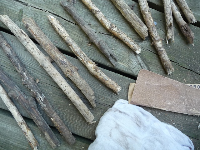 1. Collect an assortment of sticks which will be used to make this hanging outdoor sculpture, and break or cut them to the desired size. Use sand paper to remove dirt or peeling bits, clean off the dust with an old cloth, and allow to dry indoors.