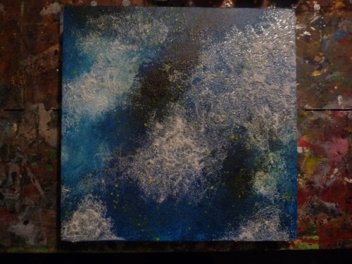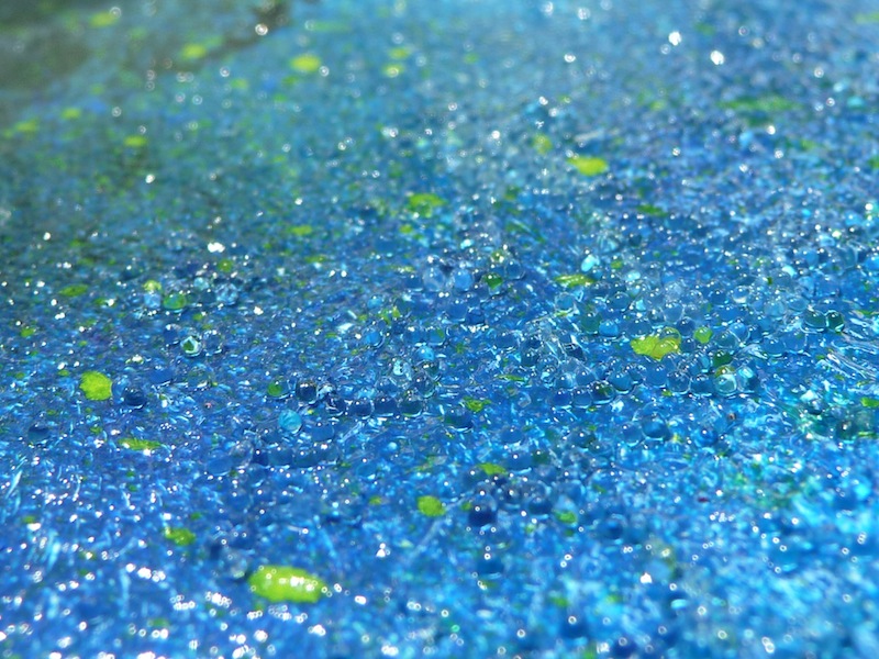 4. After some neat sponging, and some fun toothbrush splattering comes the very cool acrylic glass bead texture gel. This is simply one of many different types of mediums which can alter acrylic paint, and creating a variety of effects. They can easily be found in art supply stores. Once the paint has dried, use a paint brush and/or sponge to apply some acrylic glass bead medium on top. You can cover the entire painting, or just a few sections. The medium will appear opaque upon application, but will dry clear and glossy, leaving an interesting beaded texture.
