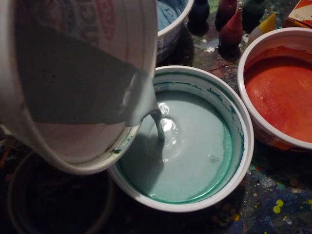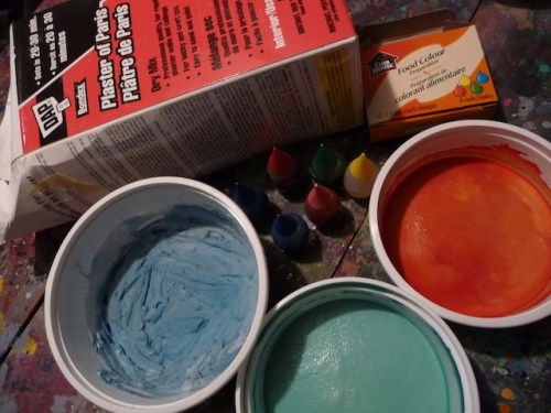 1. Like sgraffito, we will be making two different coloured layers of plaster, and scratching out a design on the uppermost layer which will expose the underlying colour. In order to do this, prepare some plaster of paris following the directions on the container. To add colour, put a small amount of food colouring or paint and mix well. Pour a small quantity into a plastic container. This first layer can be as thick as you like, but should be at least 1/2″ so it doesn’t break easily. Allow to dry overnight.