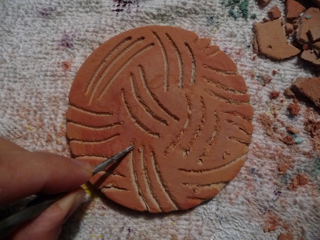 3. Once this second layer has dried, gently bend the sides of the plastic container, and turn it upside down in order to release the dried plaster. If the edges are a bit rough, you can easily sand them down. Use a metal tool like an awl or metal skewer to scratch out a pattern or design. Don’t be too rough since chunks of the plaster can break off. As you scratch areas off, you will be able to see the underlying colours.
