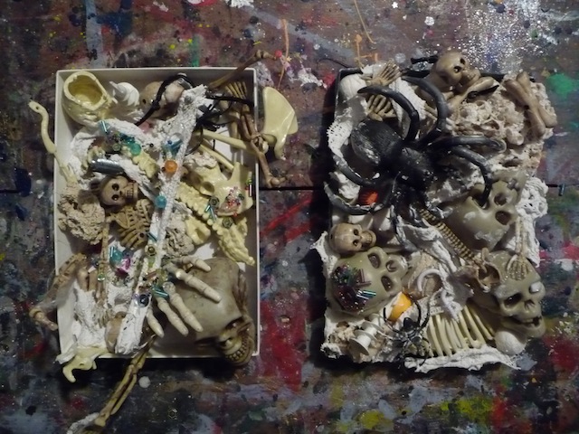 2. Arrange these items in the lid, making sure to cover the bottom well, and glue them down once you’re happy with the layout. Glue guns are great for immediately holding things in place. Try adding a bit of texture by dipping small strips of Plaster of Paris in water, and draping them around the objects. If you are using cobwebs, add them after everything has been painted.