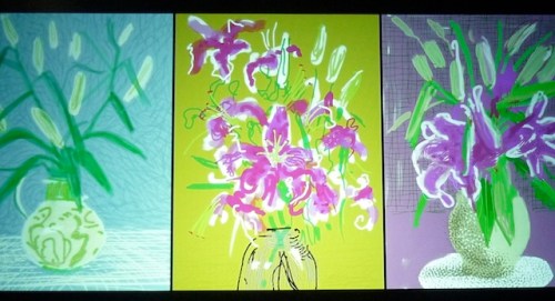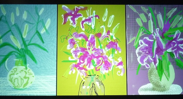 A few images of what David Hockney was up to at his recent show in Toronto. These images were projected on large screens, but the majority of his work was shown on iPhones/iPod Touches and iPads, with many in playback mode: