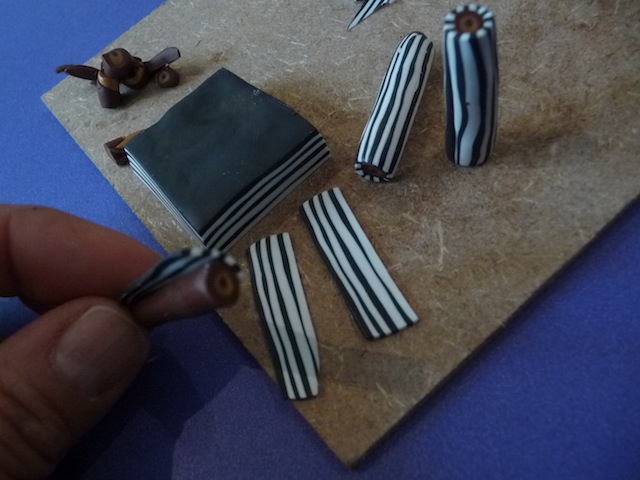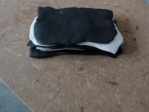 2. To make the black and white striped pattern you see in the photos, roll out a layer of white clay, and a layer of black clay. Once they are quite thin, use a razor blade to cut them into small rectangles of similar size, so you have four of each colour. Stack them, alternating the colours. Use the blade to trim the edges so they are nice and straight. Slice several thin, lengthwise layers to wrap around the long shape previously made. You may have to trim the final layer of stripes so it fits in properly. Roll gently and trim edges.