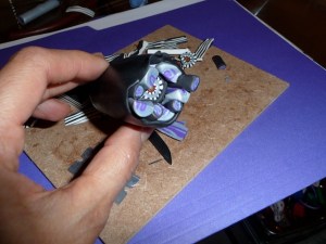 A glass table is perfect for working with polymer clay, although any clean surface will do. Make sure you have a small piece of wood on hand when using the razor blade. It provides a good cutting surface which doesn’t dull the blade too quickly.