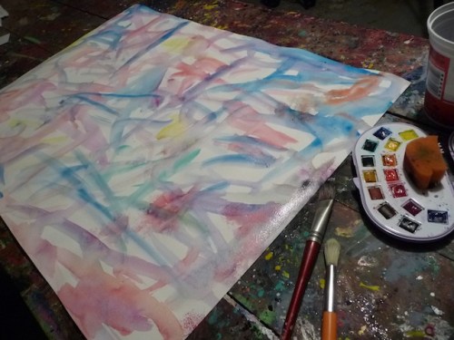 1. Splattering paint is a lot of fun, but tends to go all over the place. If you can’t do this outside, make sure your work area is well covered with newspaper or tarps. Select a large sheet of watercolour paper that is at least 90 lbs in weight, so it absorbs the water and paint without too much buckling. Using watercolour paint and a large brush, cover it with a variety of colours, making sure some areas of the white background are left unpainted. Allow to dry.