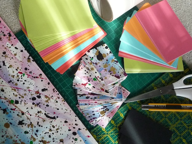 4. Cut the large sheet of splattered paint into the size you will be using on the cards. I can’t recommend the Omnigrid ruler enough for this. It makes measuring and cutting so much easier. Remember to also mount them on another colour. I used black because it brings out the colours nicely. Once the artwork and black backing have been cut, your assembly line can begin. Kids tend to love this for some reason. Small pieces of double sided tape first need to be added to all four corners of the back of the artwork. They also need to be added to the back of the black backing. Stick the artwork onto the black cards. With the artwork on the black card, stick it onto the greeting card. At this point they should be looking pretty impressive, and you’ll be amazed by how many you can make from just one sheet of paper. We ended up with 50 cards and some artwork to spare.