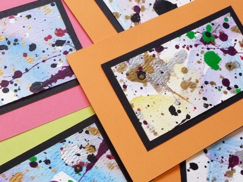 Most of us need a steady supply of greeting cards throughout the year for various occasions, but never as much as now. These Jackson Pollock style splatter cards are easy and fun to make, so let the assembly line begin.