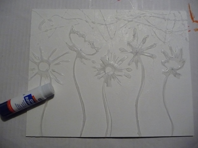 3. Glue can now be added on top of the pencil lines. The purpose of the glue is to create raised sections which will show through the foil when added on top. Aleene’s Tacky Glue was recommended because it doesn’t spread out as much a regular white glue. Again, keep any details to a minimum or it will be difficult to work the foil around them. Allow to dry completely.