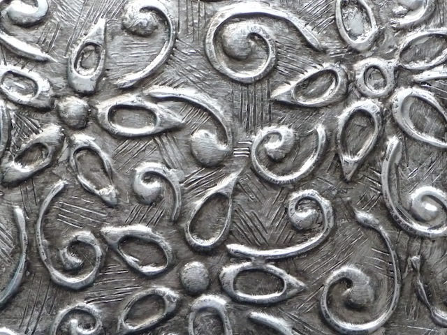 6. Once finished, use a dull pencil (too sharp and it will break through the foil) to add any extra details by pressing gently onto the cardboard. A variety of shapes such as lines, swirls and circles will add wonderful texture to the piece.