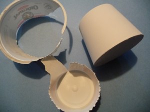 1. Plaster of Paris should be mixed in an old or disposable container, and according to the instructions on the package. I used a large yogurt container for mixing, and small yogurt containers as molds. They are convenient to use, and easy to remove. When the plaster is ready, pour it into the molds and allow to dry for at least a day, before removing the container.