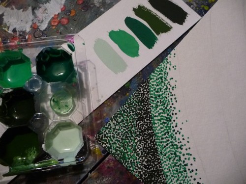 Have a good look at the colours in the selected image. There will likely be many more than kids realized, but selecting just a few will keep it manageable, and great results will still be achieved. Now mix the selected colours. Have children apply dots or short strokes to the paper, while keeping an eye on the image they are interpreting.