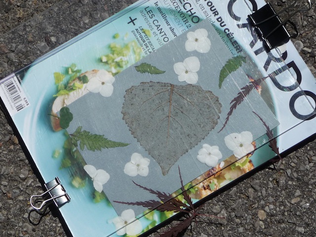Once ready, uncover a sheet of light sensitive paper, lay it down on a flat surface away from the sun, and arrange the objects on top. Cover with a piece of clean glass or plexiglass to hold everything in place. This is helpful when using objects like feathers and leaves because it ensures light will not get underneath the edges, so images will appear sharp.