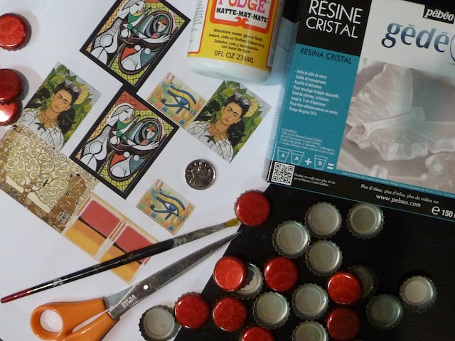 I love that moment when inspiration works its magic, and a cool idea enters your head. In this case, I saw a great exhibition of Frida Kahlo’s work at the AGO, and in the gift shop were some bottle cap magnets with her image inside (see photo at the end of this post). I started thinking about the zillions of bottle caps I’ve collected, and how cool it would be to fill them with images of art to create a matching game. Most kids do end up playing a variety of matching/memory games when they’re young, and making their own would be awesome.