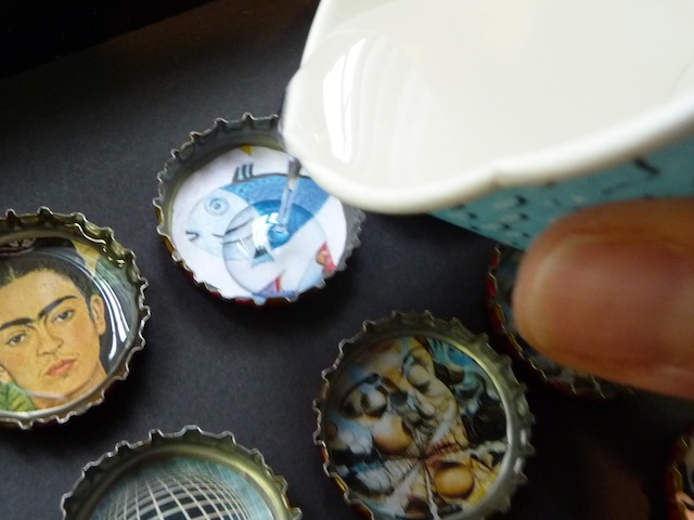 3. I bought Pebeo’s Gedeo Crystal Resin Kit, which worked beautifully. It simply involves mixing a resin with a hardener, gently stirring to avoid making bubbles, and once clear,  pouring the resin into the caps.