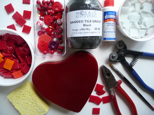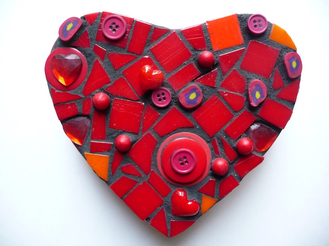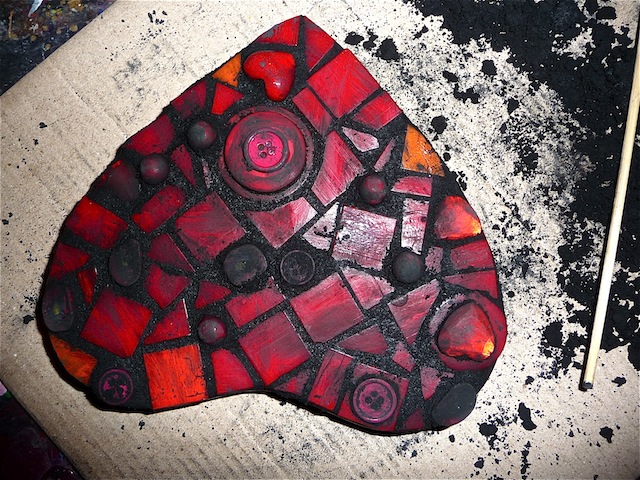 2. To make the heart, collect hard objects that can withstand grout going on top. We used a combination of tesserae tiles (Venetian glass) found in craft stores, buttons, heart shaped jewels and magnets, polymer clay decorations, etc.