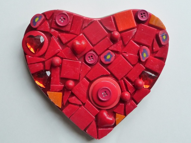 3. Making the heart requires fitting all the pieces together with just a small amount of space left between them for the grout. It’s a bit like making a puzzle. If you’re making your own heart design rather than covering a heart shaped lid, make sure to use contrasting colours to surround it and fill in the rest of the surface, otherwise the heart won’t stand out.