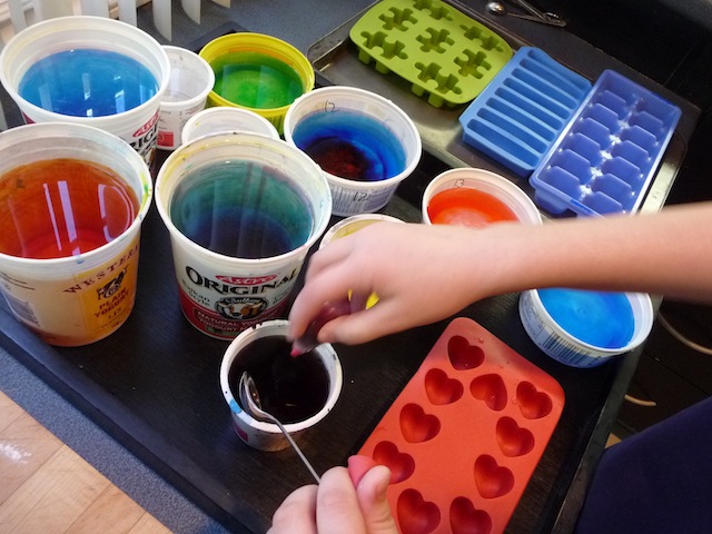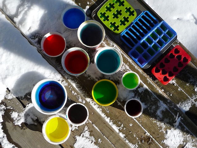 1. Gather an assortment of plastic containers and ice cube trays to provide a variety of shapes and sizes to work with. Fill them with water, add food colouring (sneak in a little lesson about colour theory), and mix. For the ice cube trays, prepare the coloured water in something like a measuring cup for easy pouring.