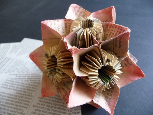 Years ago, we had a visitor from Japan who gave us a kusudama flower she had been discreetly making during her stay here. It was simply beautiful. Over a period of several months, she had been quietly cutting, folding and assembling pieces of newspaper in her room whenever she had some spare time. That meant folding 60 petals, assembled into twelve flowers, to create a ball-like shape referred to as kusudama. She also added a touch of watercolour paint to the edges, using one of those cool Japanese water brushes. You can see a photo of the flower at the end of this post.