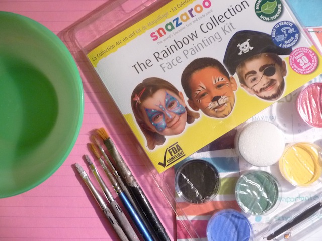 I recommend using a face painting kit because of their hypo-allergenic, non toxic paints. They’re easy to use and to wash off. And don’t forget to take some photos, before you wash your wonderful creations down the drain.