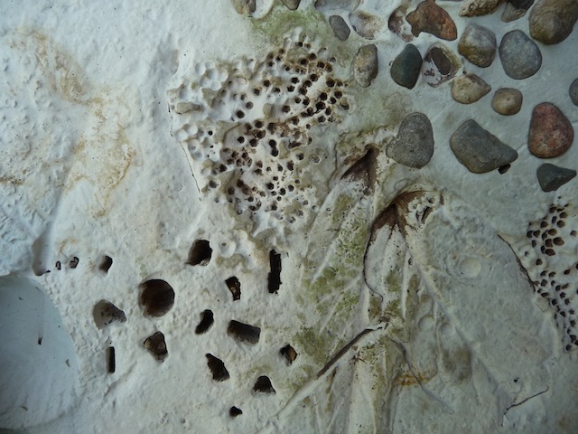 3. Allow plaster to set slightly, before carefully laying the items on top. To make impressions, remember to place the textured side of the items face down. For any items you’d like to leave in the plaster eg. pebbles or sea shells, the good side should be face up. We did a combination of both.