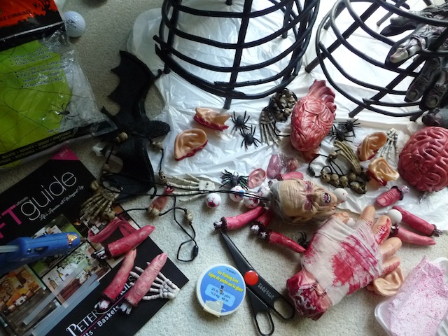 2. I found using a glue gun worked well for most things, but some rubbery body parts refused to adhere. For those, I threaded a needle with fishing line, and pulled it through the part to attach it to the wood. I also used fishing line in a similar manner for hanging things in the centre. Wire worked well for attaching heavier items like the bat.