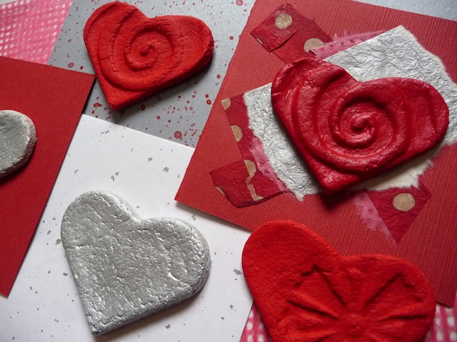 Once they have cooled, use sand paper to smooth the edges, then add acrylic paint to decorate – undiluted for intense colours, or combined with plenty of water to create washes. Hearts can be further decorated with glitter glue, or even with a collage of interesting papers. Applying Mod Podge as a final touch will give them a shiny, varnished look.