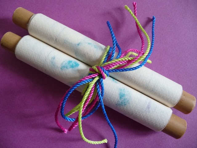 To make the back of the paper look nicer when it’s rolled up, you can cut a length of coloured paper, same length as the drawing, but the width can vary if you want some of the edges showing. Attach it with white glue or double sided tape. That way, you won’t see the marker showing through like it does below. This step needs to be done before attaching the paper to the dowels.