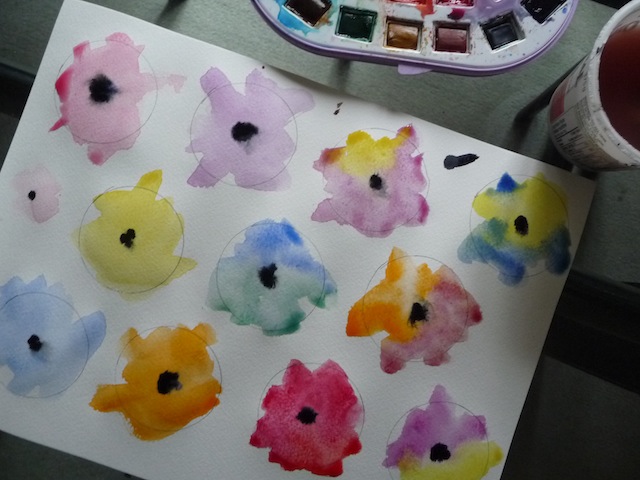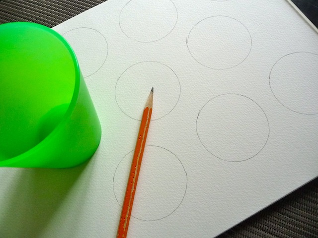 1. Determine how big you would like to make your flowers, and draw the appropriate sized circles on a sheet of watercolour paper, using a pencil. If you don’t have a circle template, you can use a cup, etc.