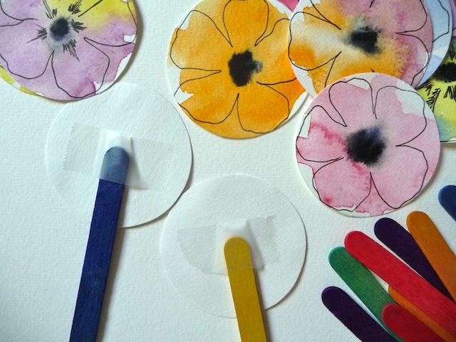 5. Attach coloured popsicle sticks to the back of the flowers using tape.