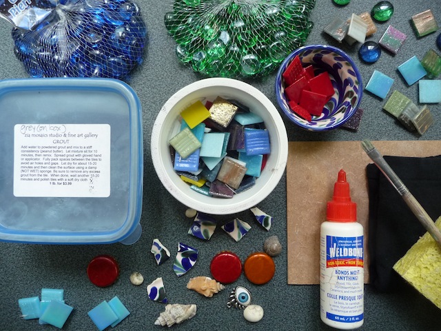 - assortment of small items to be used in the mosaic eg. broken ceramic pieces, glass beads, seashells, etc.