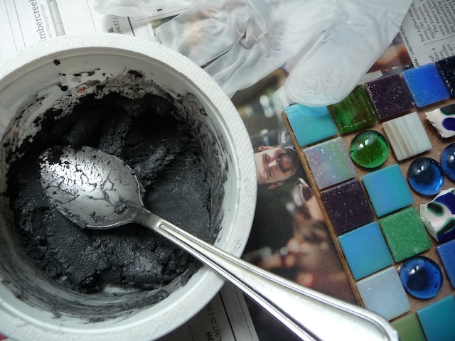2. Prepare grout by placing it in an old plastic container, and adding small amounts of water at a time, while mixing together. The grout should be the consistency of peanut butter, so not too wet. With a glove on one hand, scoop up small amounts of grout and apply on top of the tiles/objects. Press it well into the spaces, and remove any excess. Make sure to fill in the edges and borders as well.
