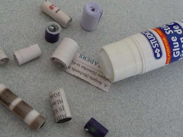 2. To make the rolls, take a strip of paper and begin rolling it tightly until you’re close to the end. Add some glue with a glue stick, finish rolling, and press well so it sticks. Other options include making more open rolls, and combining several different coloured strips in a single roll. The possibilities are endless…