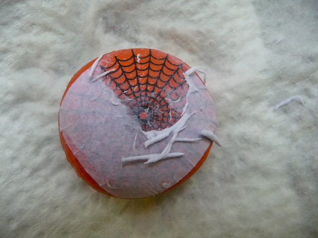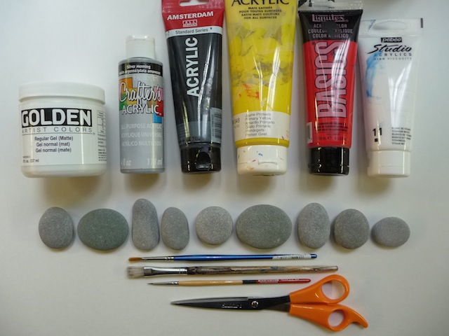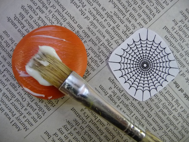 Gather some clean, dry rocks. Paint base colours on them, like orange, white and black. You may need two coats. Once dry, add details on top. You can stick to paint, or you can also use Acrylic Gel Medium to transfer images, like I did with the cobweb. To do this, add the medium, using a paint brush, onto the painted rock.