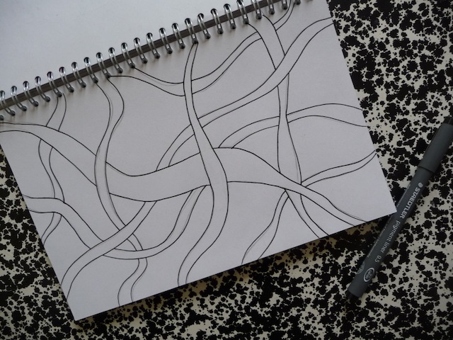 1. Using a pencil, divide a paper into sections of varying sizes, by making pairs of lines in all directions. Go over the lines with black marker. You’ll need fine tipped markers to create detailed work, and there are plenty to choose from. I’d suggest going to an art supply store and trying out different sizes and brands, to see what you prefer. I found 0.1mm, 0.2mm, and 0.5mm great to work with.