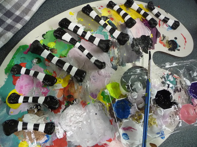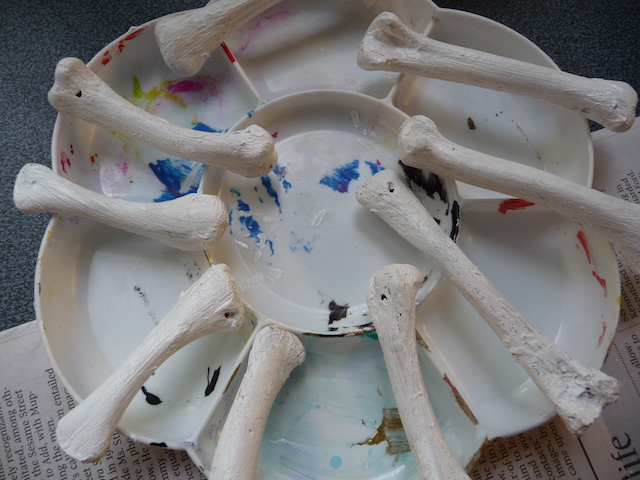3. Paint the bones in any Halloween themed colour or pattern that strikes your fancy. If you’re making them black and white, paint the bones in white and allow to dry. Then add black stripes.