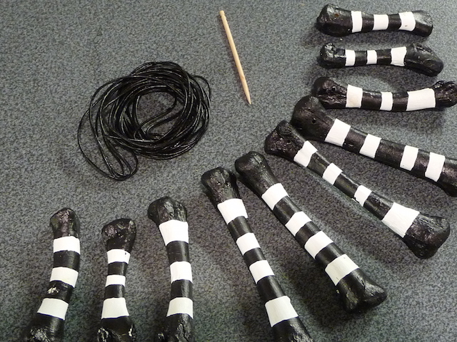 4. P1250900Lay your dry bones out in a pattern you would like for your necklace. You can aim for smallest to largest to smallest, or a random design. You may need to poke a toothpick through the drilled holes to remove any paint that made its way inside. P12509075. Thread the string through, and tie a knot at the end. If you want to create a little space between each bone, make a small knot in between them. You can also combine the bones with other things like feathers and mini skulls, easily found at dollar stores and bead shops.P1250936
