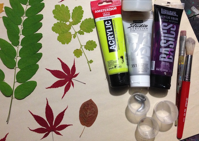 6. Once you’ve finished layering a number of different colours, lift the leaves off and lay them onto newspaper to dry. It’s important to do this, as I learned, otherwise delicate leaves will remain stuck to the paint and break off.