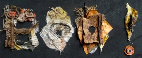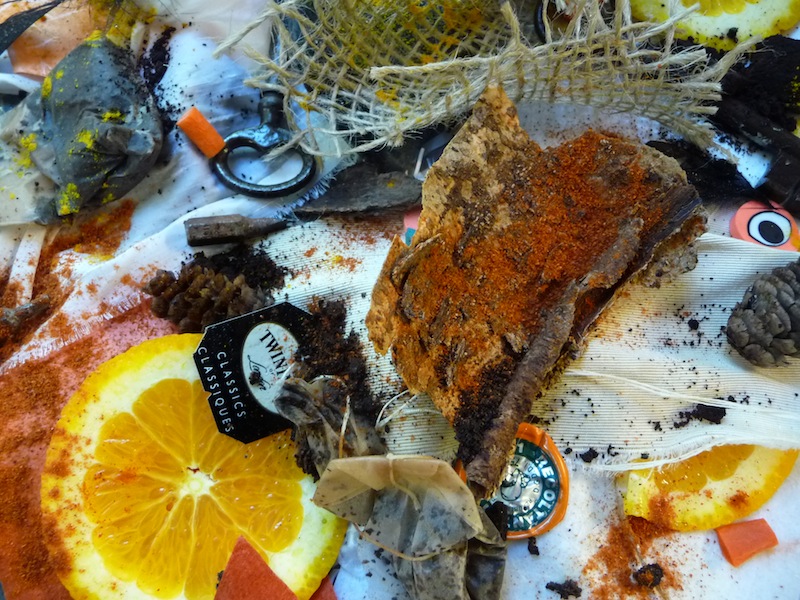 When I finally went out to collect it, my biggest fear was finding it filled with potato bugs and worms, sucking back those juicy orange slices I included. Turns out it was bug free, and had morphed from a colourful collection of random things, to something you might find in a landfill site. The oranges had decomposed, plenty of stains were now on the fabric and paper, but some things simply hadn’t changed at all. More perishables and more time would have created better results, but there was still plenty to work with for making a Halloween sign and a collage.