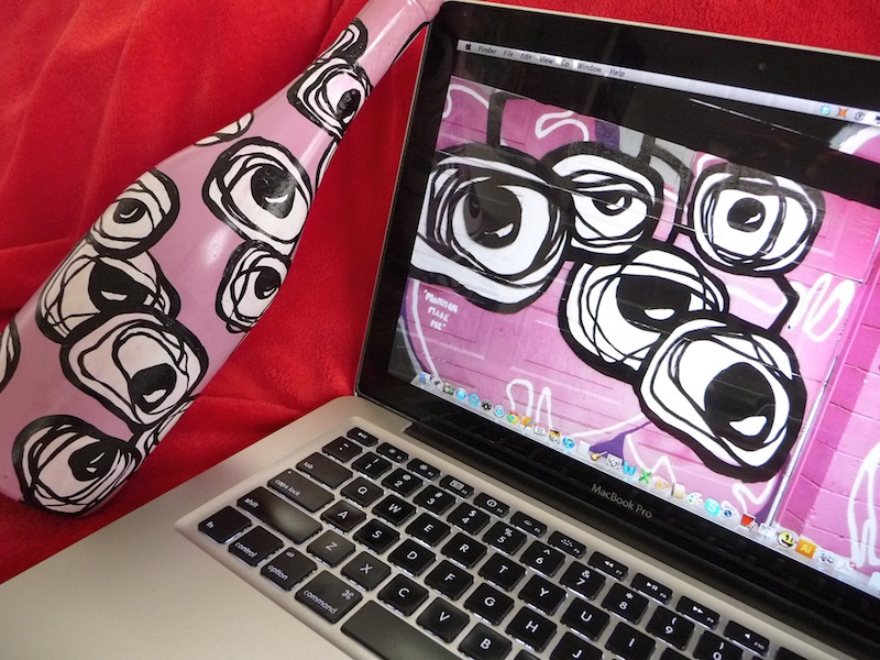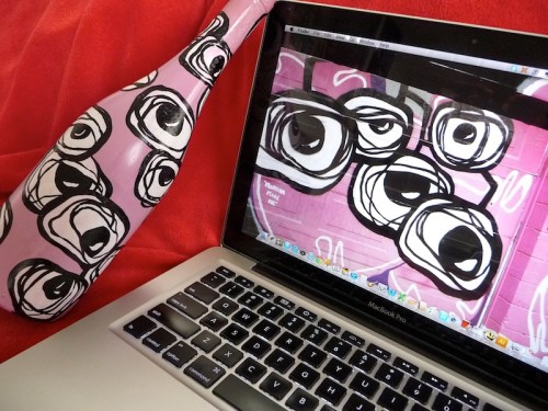Years ago, one of my school assignments involved creating a collection of textile designs, and painting one of them on a household object. I chose a wine bottle because it was readily available, and surely considered a household object in France! This time, I thought a graffiti theme would be fun, and included the image above to show you my source of inspiration, which I found painted on a garage door. If lurking about back alleys isn’t your thing, the internet is filled with great images for you to consider using.