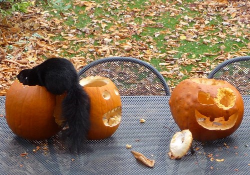 The morning after Halloween is much anticipated by the squirrels in this hood, but the pumpkins are terrorized. Just a reminder to hang on to all those candy wrappers your kids will be generating. They can be used to make a Candy Wrapper Collage coming up this month.