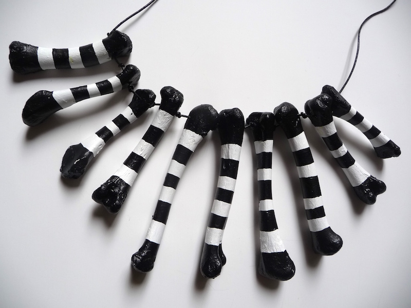 I recently unpacked our Halloween decorations and came across this old chicken bone necklace, which had been left unpainted. I decided it was time to give it a second life and brought out the acrylics.