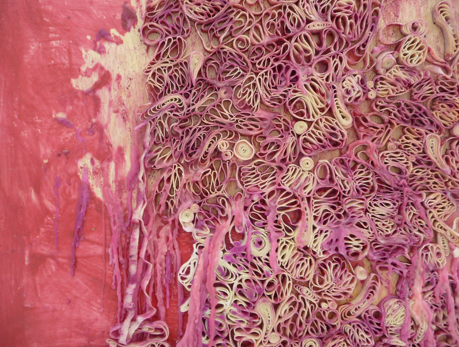 Amanda Muis’s canvas and encaustic on wood was beautiful. From a distance, I was tempted to think pasta. But on closer inspection, it reminded me of a microscopic view of something like mitochondria… traces of high school biology lingering in my brain.