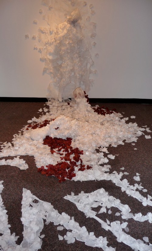 Tiffany Eting Wu’s fibre art installation provides an interesting commentary on how crime scenes are represented in the media. Her hundreds of delicate, white flowers were in perfect contrast to the subject matter.